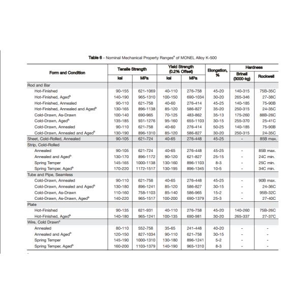 N05500 is a precipitation-hardenable nickel-copper alloy that combines the excellent corrosion resistance characteristic of Monel 400 with the added advantage of greater strength and hardness. These amplified properties, strength and hardness, are obtained by adding aluminum and titanium to the nickel-copper base and by a thermal processing used to effect precipitation, typically called age hardening or aging. When in the age-hardened condition, Monel K-500 has a greater tendency toward stress-corrosion cracking in some environments than Monel 400. N05500 has approximately three times the yield strength and double the tensile strength when compared with alloy 400. Plus, it can be further strengthened by cold working prior to precipitation hardening. The strength of this nickel steel alloy is maintained to 1200° F but stays ductile and tough down to temperatures of 400° F. Its melting range is 2400-2460° F.